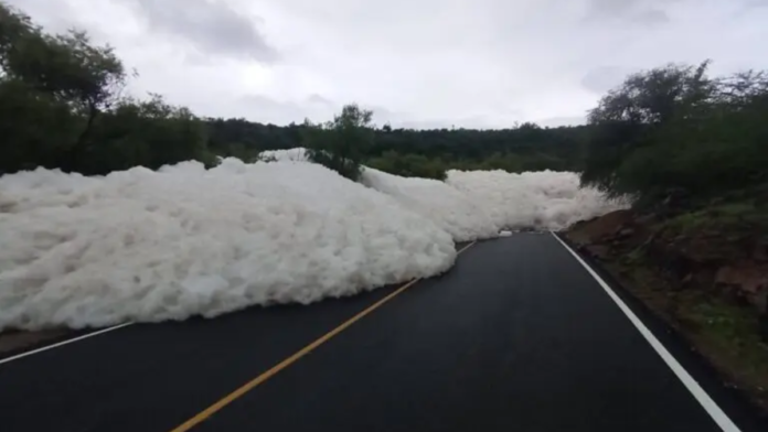 Un tramo de la carretera Alfajayucan–Chilcuautla se encuentra bloqueado debido a una densa acumulación de espuma proveniente de un canal de aguas negras cercano, generando preocupación entre automovilistas y habitantes de la zona.